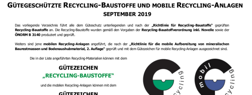 Liste der gütegeschützten Recycling-Baustoffe und mobilen Recycling-Anlagen – September 2019