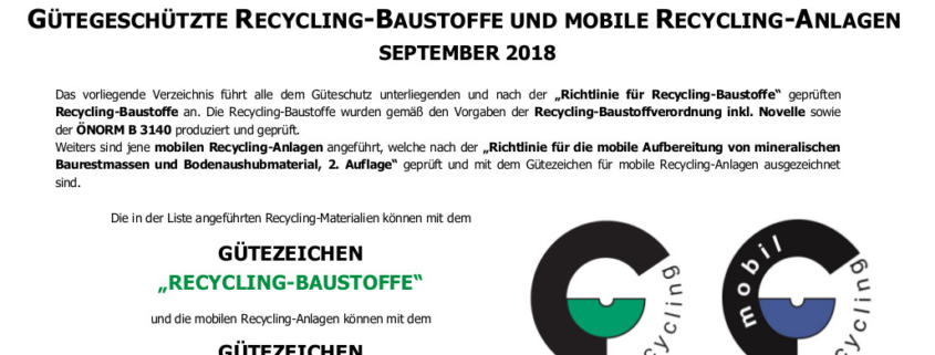 Liste der gütegeschützten Recycling-Baustoffe und mobilen Recycling-Anlagen – September 2018
