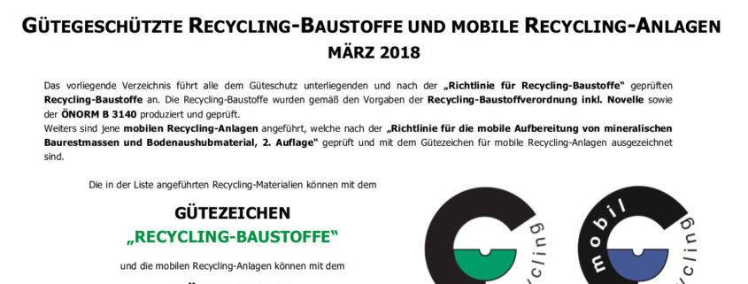 Liste der gütegeschützten Recycling-Baustoffe und mobilen Recycling-Anlagen – März 2018